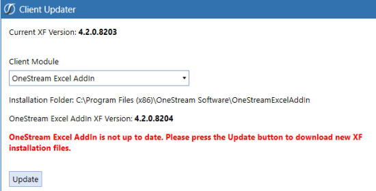 The Client Updater is used to retrieve updated software from the OneStream server for the Excel Add-In client program when the version being used does not match the version found on the server being connected. Note that in order to perform the update, the user needs to be able to write to the installation folder. From this page, the user can first save work and then restart using elevated Windows privileges using the Restart OneStream as Windows Administrator button.