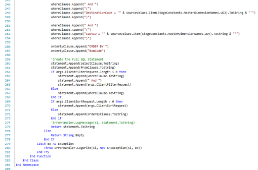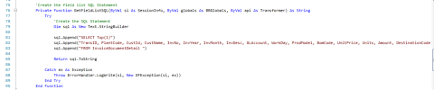 selectClause.Append("TransID, PlantCode, CustId, CustName, InvNo, InvYear, InvMonth, InvDesc, GLAccount, WorkDay, ProdModel, BomCode, UnitPrice,Units, Amount,