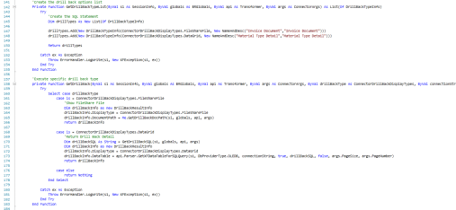 ByVal connectionString as String) As DrillBackResultInfo Try Select case drillBackType case is = ConnectorDrillBackDisplayTypes.FileShareFile 'Show FileShare File Dim drillBackInfo as new DrillBackResultInfo drillBackInfo.DisplayType = ConnectorDrillBackDisplayTypes.FileShareFile drillBackInfo.DocumentPath = Me.GetDrillBackDocPath(si, globals, api, args) return drillBackInfo case is = ConnectorDrillBackDisplayTypes.DataGrid 'Return Drill Back Detail Dim drillBackSQL As String = GetDrillBackSQL(si, globals, api, args) Dim drillBackInfo as new DrillBackResultInfo drillBackInfo.DisplayType = ConnectorDrillBackDisplayTypes.DataGrid drillBackInfo.DataTable = api.Parser.GetXFDataTableForSQLQuery(si,