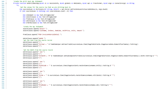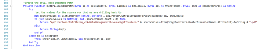 ByVal globals As BRGlobals,ByVal api As Transformer, ByVal args As ConnectorArgs) As String Try 'Get the values for the source row that we are drilling back to Dim sourceValues as Dictionary(Of string, Object) =